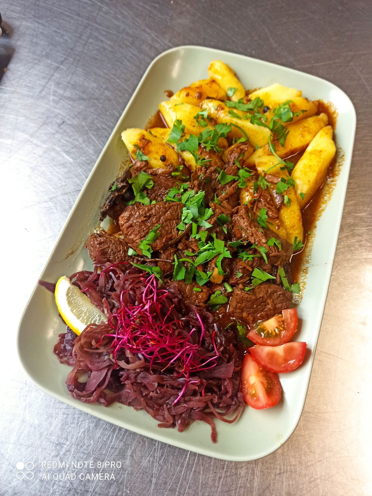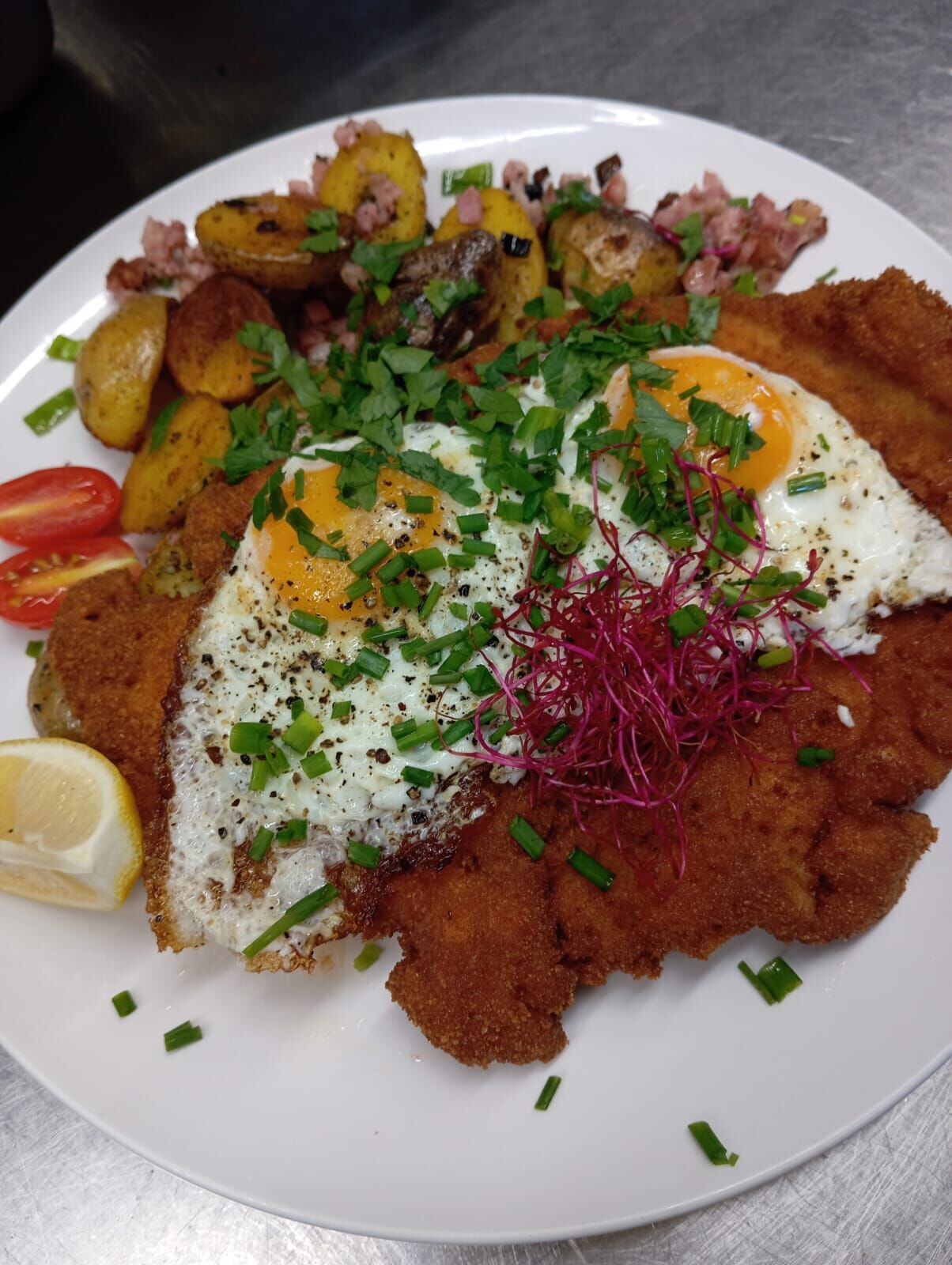 Für den kleinen und großen Hunger gibt es unter anderem deftige Klassiker wie das Schweineschnitzel "a la Chef"mit Bratkartoffeln und gebratenem Kohl oder das Cordon Bleu – zartes Schweineschnitzel gefüllt mit Schinken und Käse. Wer Lust auf etwas Besonderes hat, kann sich an Bigos erfreuen, einem Sauerkrauteintopf mit polnischer Wurst, Fleisch und Pilzen, serviert mit Bauernbrot.